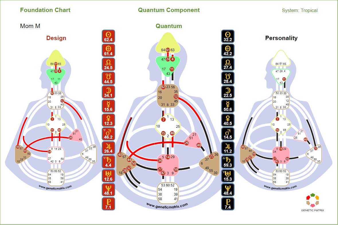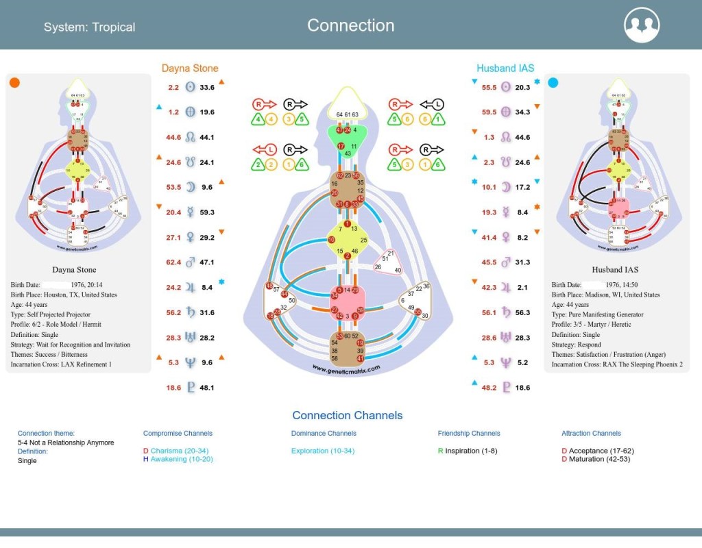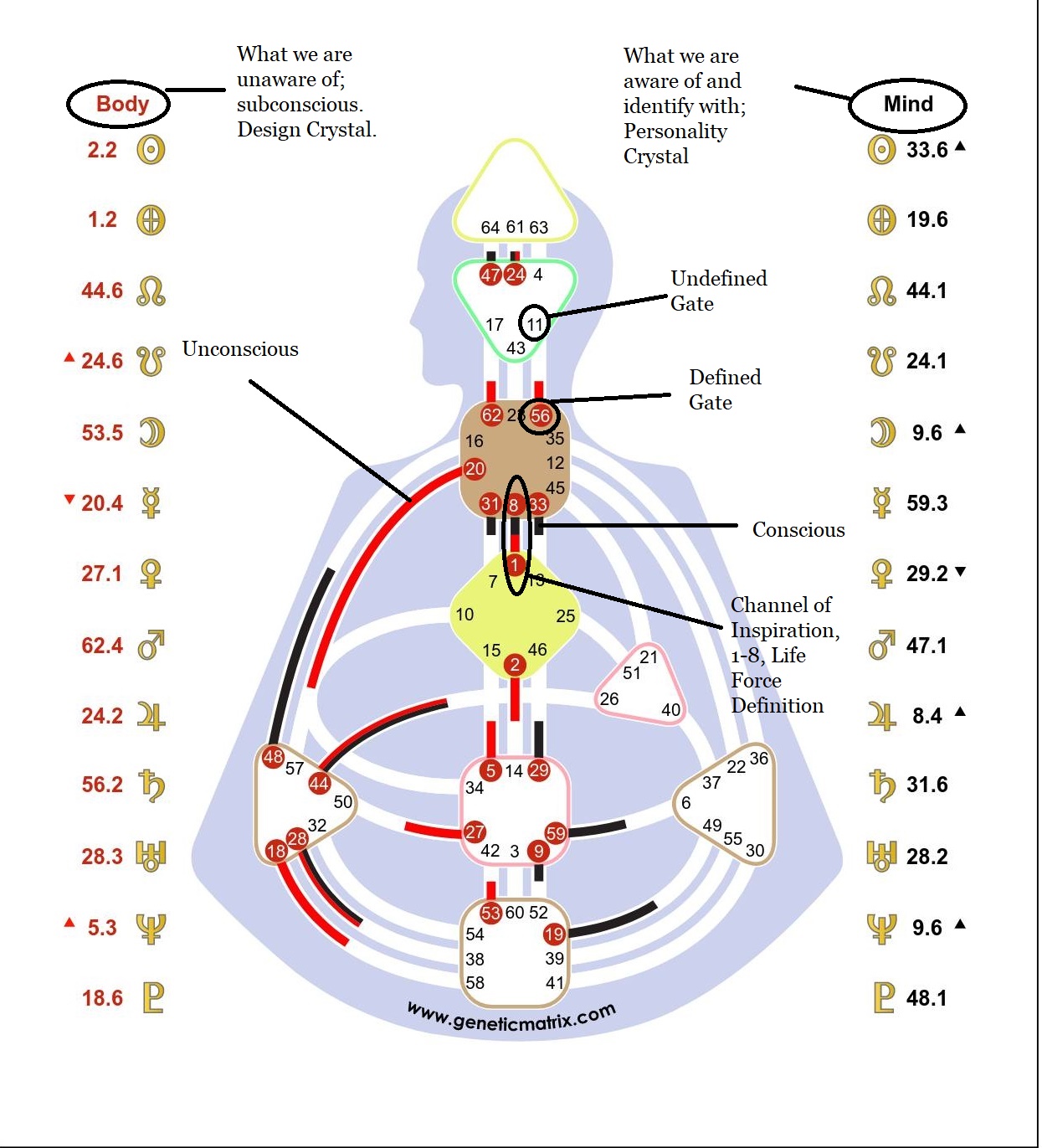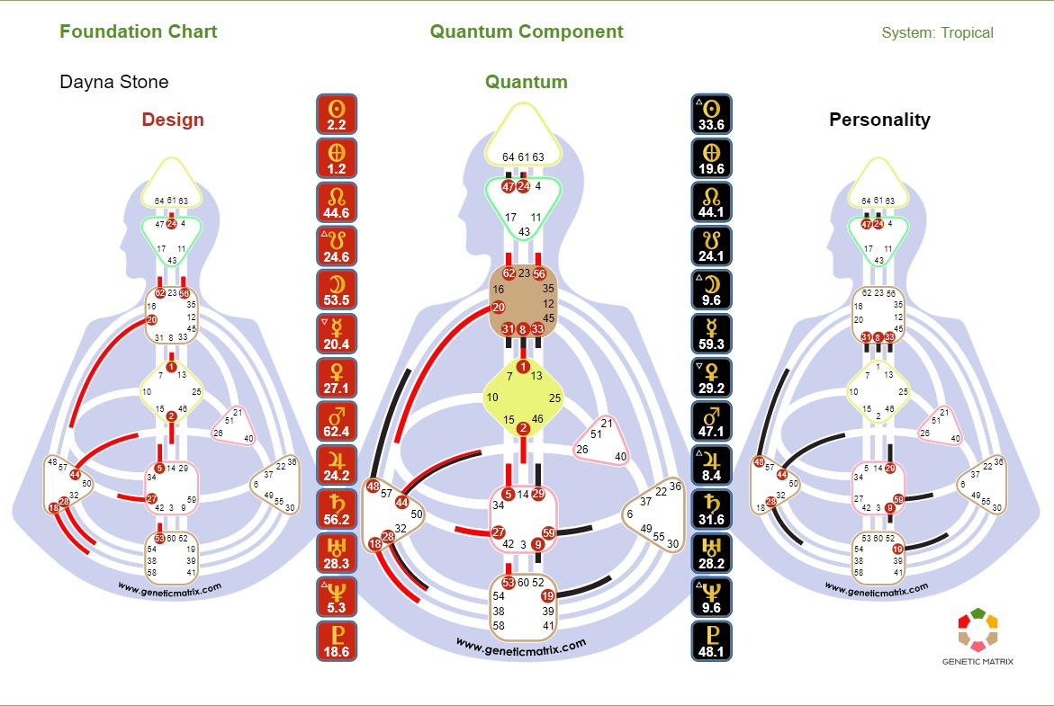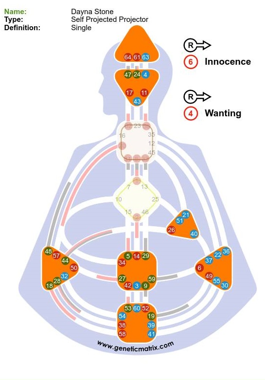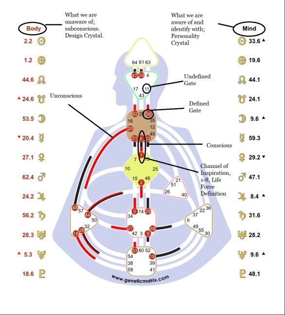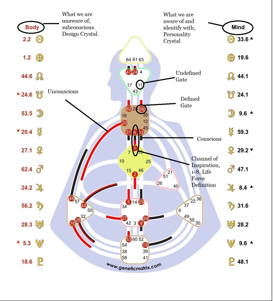 Channels/Circuitry: 23-43 Channel of Structuring, Gate of Insight and Gate of Assimilation, Individual Knowing Circuit, “empower efficiency”. 1-8 Channel of Inspiration, Individual Knowing Circuit, “creative self-expression”, “I know I can or cannot make a contribution”.