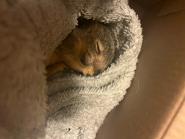 Squirrel: Found a baby squirrel on the sidewalk. He looked dead but when I touched him he squealed and squirmed. No mom or nest in sight. I was walking my dog so called and had my husband send the kids with a blanket. They came, I scooped up the tiny baby and took her home. Though I know how to raise baby squirrels (did it as a kid), I decided to take her to a rehab center.