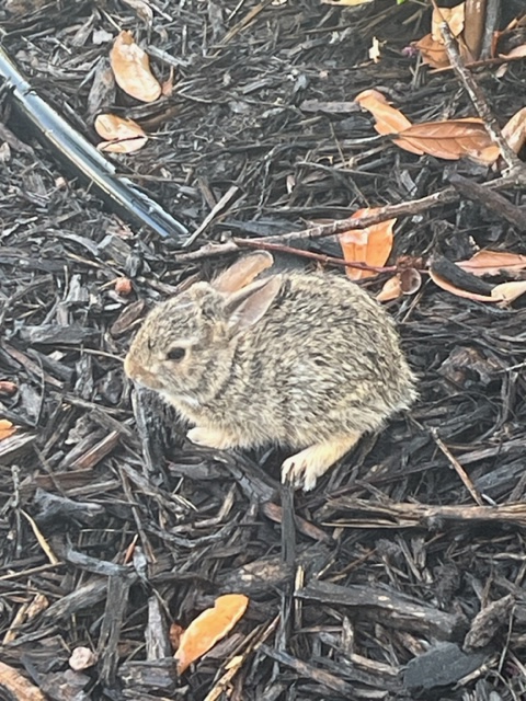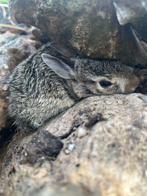 Bunny: This morning I was watering my garden and a baby bunny hopped out, fearless. I went and touched it and it squealed and ran to hide. I left it alone since it was obviously old enough to survive on its own.